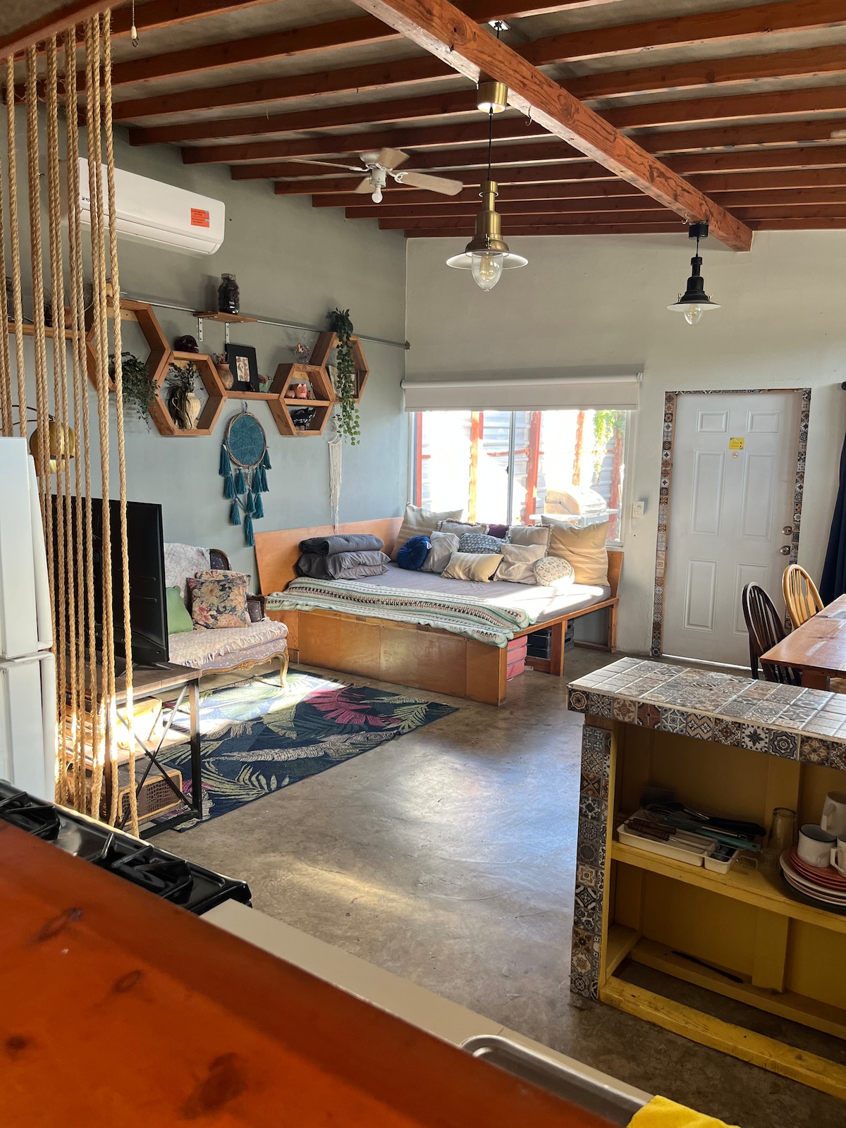 Casa Bohemian is a cozy tiny house with a rustic Boho chic design that creates a warm and relaxing ambiance. It's perfect for a couple’s getaway, a friends' reunion, or a family holiday—making it the ideal place for your San Felipe vacation. The house features a dining table for six, a fully equipped kitchen, a bathroom, three queen beds, a bedroom, a living room with a smart TV, and a private patio with a BBQ and fireplace.