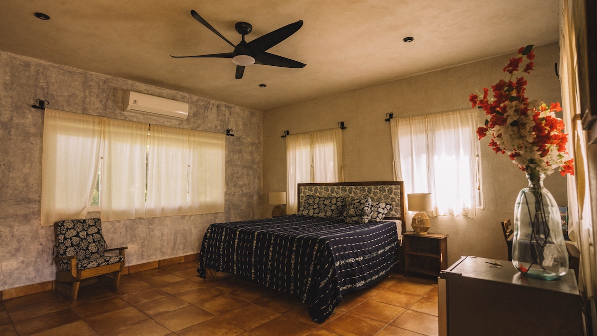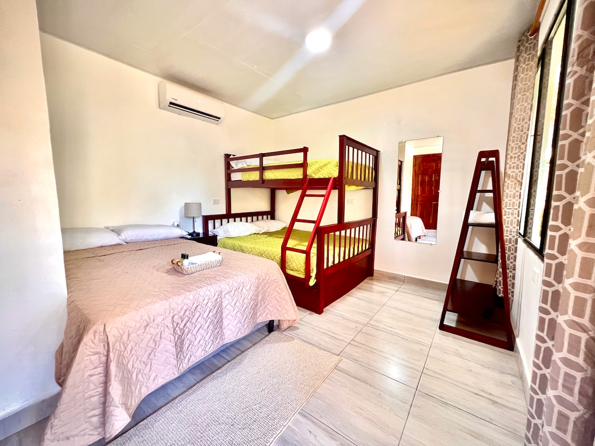 This open-concept loft in El Zonte offers stylish seclusion, just steps from the surf. With fast Wi-Fi, it’s perfect for remote work, while the spacious patio provides a great spot to relax. For larger groups, you can book the downstairs Shiva Surf Loft for extra space. The loft includes a king-size bed (or two singles), with an option for a third bed, making it ideal for couples or friends. Located on the second floor, it has air conditioning, a full kitchen, bathroom, desk, and a cozy couch.