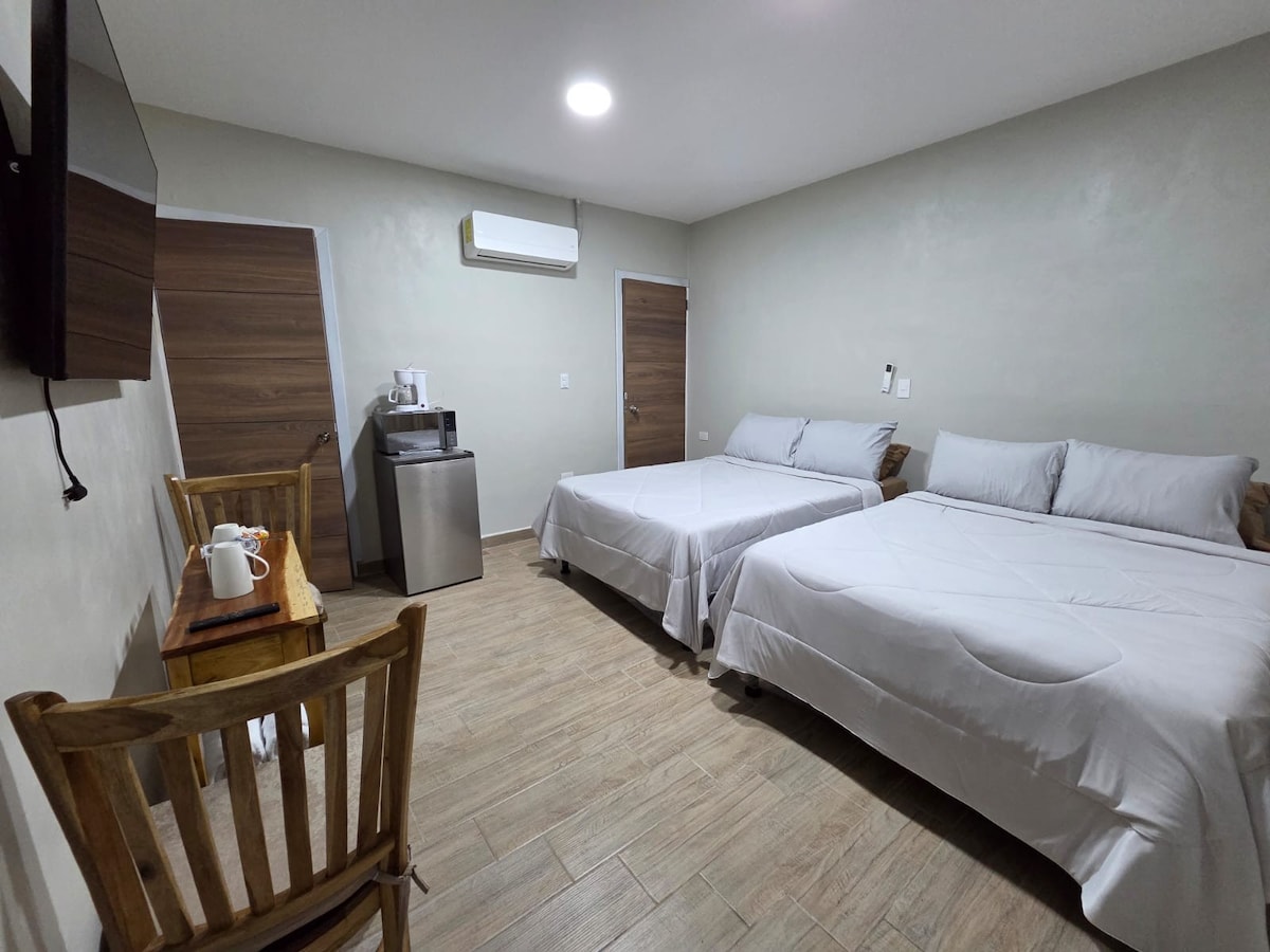 Wake up between the palm trees, the sound of singing birds and the smell of tropical flowers. Our Guesthouse La Canasta is located in the heart of Playa El Zonte. Walking distance to beach (30 meters), restaurants, some little stores & different skateparks. A surfers paradise: a Right hand point break, A-Frame & Beach break all on one beach. FAMILY ROOM: 1 King bed + 1 Queen bed - Max. 4 persons ALSO AVAILABLE AS KING ROOM: 1 King bed + Desk Send us a request if you prefer this set up.