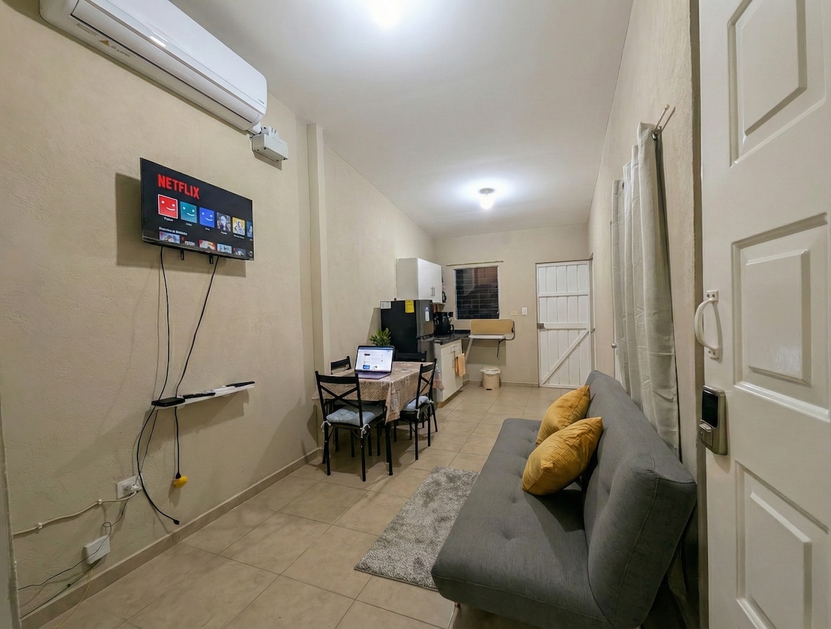 Villa de Vientos, en el corazón de Apaneca, cautiva a primera vista con su primaveral jardín interior en el que convergen tres apartamentos. Independientes, equipados al detalle y con baño propio, todos ofrecen confort, privacidad y lo necesario para sintonizar con la naturaleza, la tranquilidad del pueblo y tener una estadía memorable. El Apartamento 1, con un dormitorio y un espacio multifuncional con cocina y comedor, acomoda a 4 personas, facilita un sofá cama en sala.
