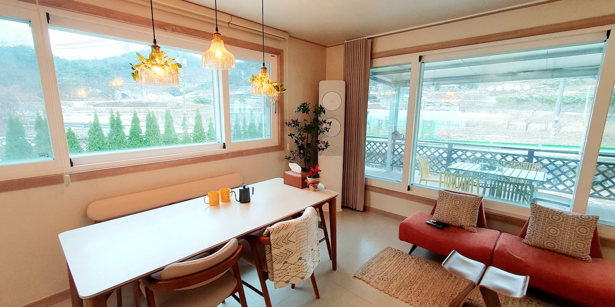 별빛하우스는 개성 넘치는 스타일을 자랑합니다. 넓은 자연속에 새로 신축된 건물로 침실에서 큰 통창으로 전원의 수채화를 즐기며 밤하늘의 별빛을 볼 수 있고 주차는 숙소 바로앞에 안바당은 완전 넓고 프라이빗 온전한 자유로움과 편안함을 주는 자연속 풍경 온실처럼 신축된 바베큐장에서 즐기는 자연도 남다르고 거실과 중정도 모두 삼중창이라 쾌적하고 개방감은 최고!! 바람불고 추운날엔 중정에서 불멍을 즐길수 있고 하조대 해수욕장도 가까워 전망대 산책길이나 해변 산책, 스쿠버나 서핑, 까페나 브런치를 즐기실 수 있습니다