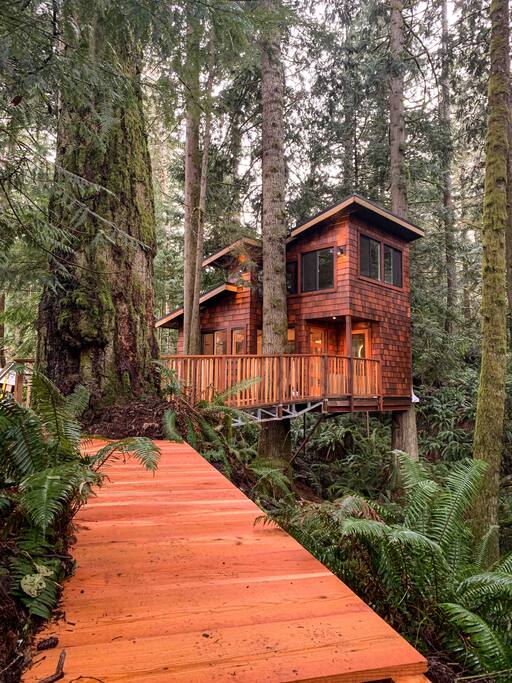 A truly unique treehouse perched 30 feet high among the trees. This amazing structure is attached to 3 large cedars and 1 giant maple using advanced tree tabs that allow the trees to sway gently, providing a natural and immersive experience. The large deck offers stunning views across the Salish Sea to the Mountains of Washington state. With all the modern amenities you could need, it's the perfect place to relax and unwind. Experience the magic and wonder of treehouse living for yourself!