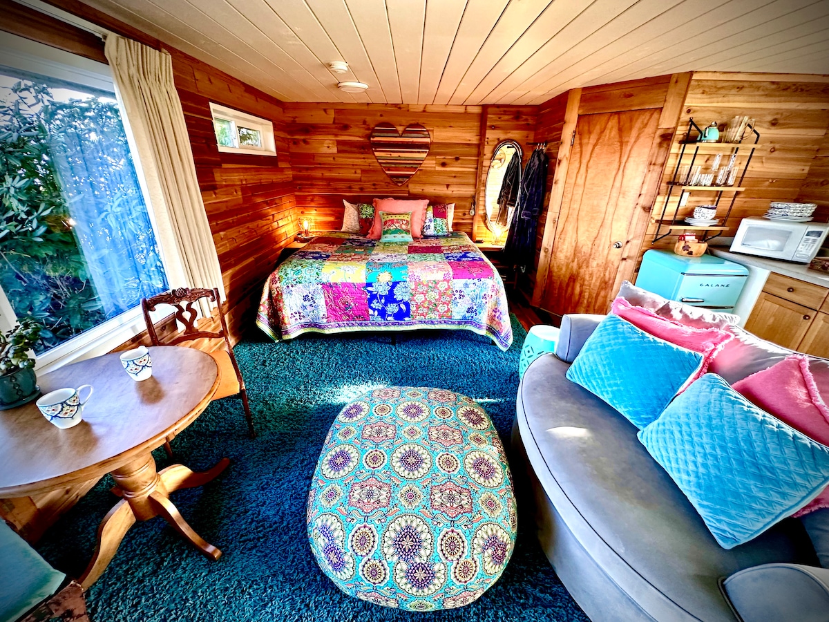 Charlies Cabin is just a 10 minute drive from the heart of Sooke. Set on a peaceful acreage with beautiful trail views, guests are welcome to walk the path behind the cabin and explore the rear of the property. Located along Sooke Road, it offers easy access to restaurants, shops, and beaches while still feeling tucked away in nature. The cabin also features an indoor fireplace and outdoor fire pit for cozy evenings.