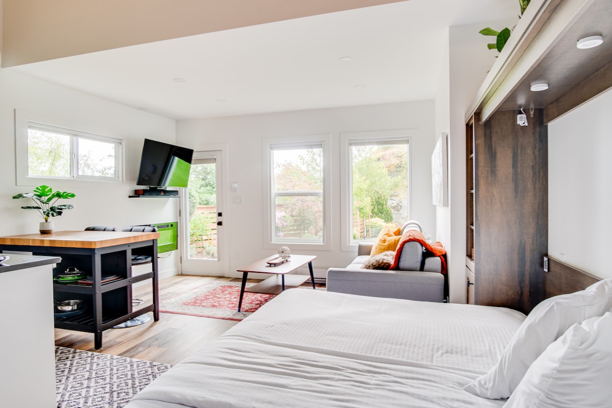 "The Woodshed" is a luxurious garden suite in the countryside, near west coast beaches, and temperate rain forests. Sit on the deck in your spacious hidden yard watching the nesting bald eagles and enjoy the fresh air. Take a breathtaking stroll through the centennial park forest or wander into Brentwood Bay to get a coffee and explore. After adventuring, lounge on the couch and watch a movie, enjoy a book in the bath or curl up in the spacious & comfortable king size bed.