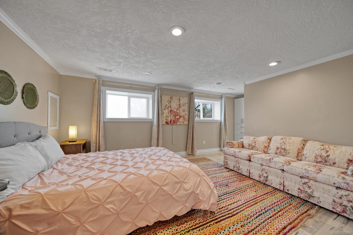 Peaceful light filled suite with serene garden and valley views and glorious sunsets. Completely private with 2 spacious bedrooms, beautiful well stocked kitchen and modern bathroom. Come for a weekend or a long stay and experience everything West Coast has to offer. Hiking trails, lake shore walks, ocean beaches and world famous Butchart Gardens are just minutes away. Wonderful Victoria and Sidney are only a 15 min drive as well as the airport and BC ferries.