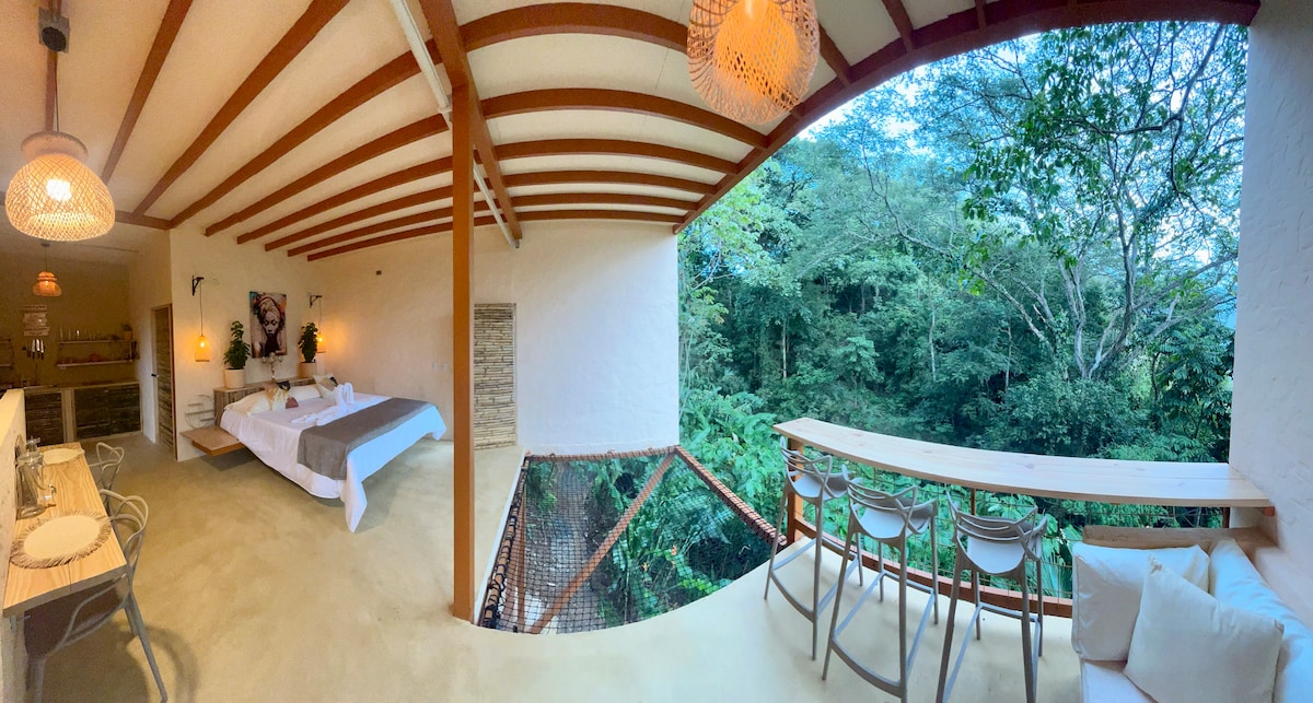Iraka Villa de Verano. Exclusiva cabina de roble rodeada de naturaleza y vistas increíbles. Ubicada en un bosque seco tropical donde podrás disfrutar de clima cálido durante todo el año. A solo 1 hora y 15 minutos de Medellín. Minipool privada para refrescarte durante el día y con opción de calefacción para disfrutar de una noche en pareja. Cómoda habitación con A/C y cama king con sábanas 100% algodón. Baño al aire libre donde podrás disfrutar de una relajante ducha con una hermosa vista.