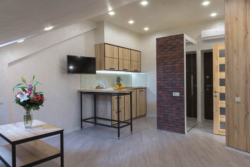 Апартаменти розташовані у самому центрі Києві, біля станції метро «Майдан Незалежності». Ці апартаменти підійдуть для людей, які цінують мінімалізм та комфорт. Інтер'єр квартири не перевантажений зайвими елементами та виконаний у сучасних тенденціях. Поєднання різних фактур («цегляна кладка», дерево) виглядає стильно і гармонійно.