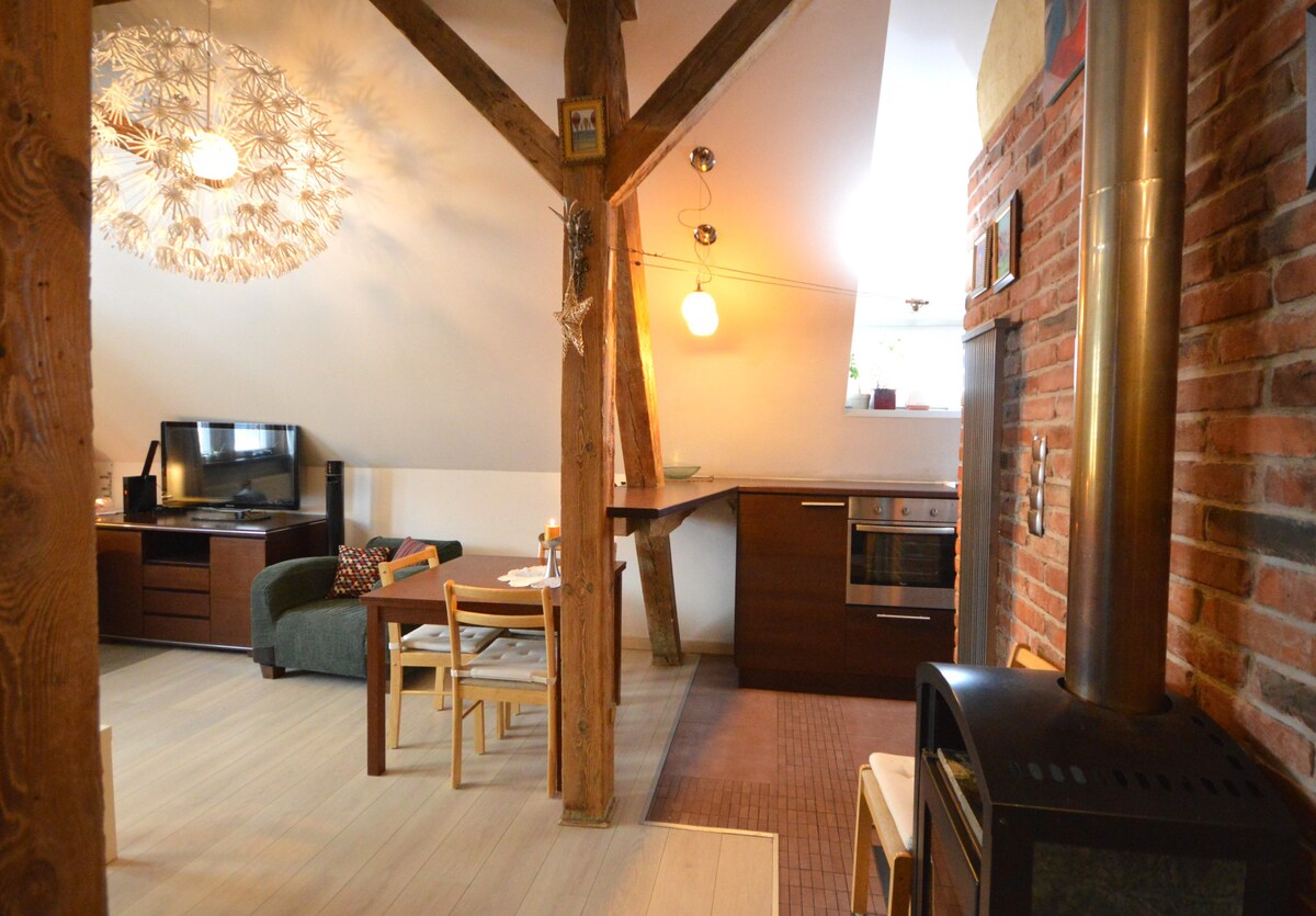 A unique apartment with a fireplace in the attic. We created this place just for ourselves, originally with paintings, books, a collection of cacti and handmade ceramics. We took care of comfort - 2 armchairs and a sofa, a fireplace and lots of pillows. There is also an equipped kitchen, a table with 4 chairs, a work desk and fast fiber-optic internet. Nearby there is a pizzeria, bar, shops, 5 min. walk to the Gdańsk Oliwa station.