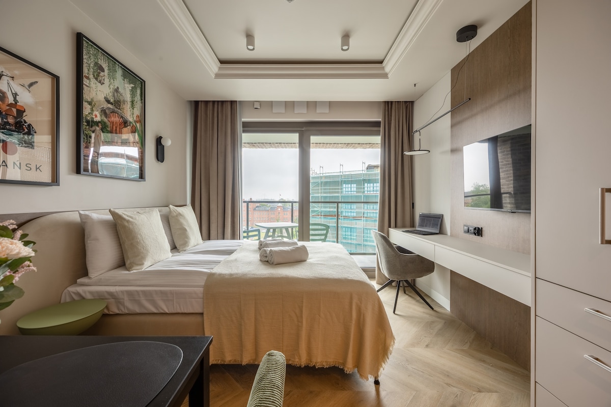 Wyjątkowy apartament z niepowtarzalnym widokiem na Stare Miasto w Gdańsku, który można podziwiać z przestronnego, umeblowanego tarasu. Apartament znajduje się w bliskim sąsiedztwie rzeki Motława. Przestrzeń w pełni spełni oczekiwania wymagających klientów, na wyposażeniu apartamentu znajdują się: klimatyzacja, ekspres do kawy oraz smart TV. Dodatkowo do dyspozycji gości jest siłownia dostępna w kompleksie (bezpłatnie).