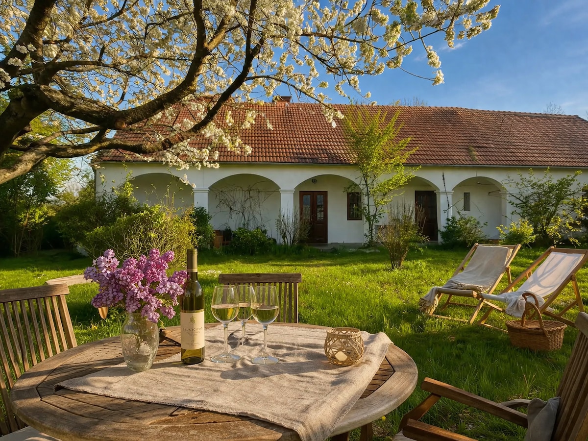 Welcome to our lovingly preserved 19th-century arcaded farmhouse, set within a spacious, fully fenced garden. Here you will find peace, open space and privacy – ideal for families, couples or groups of friends seeking nature and a slower pace of life. The house offers 100 m² of living space, three bedrooms for up to seven guests, a 30 m² covered terrace with historic arcades, and plenty of outdoor areas to relax and unwind in the greenery.