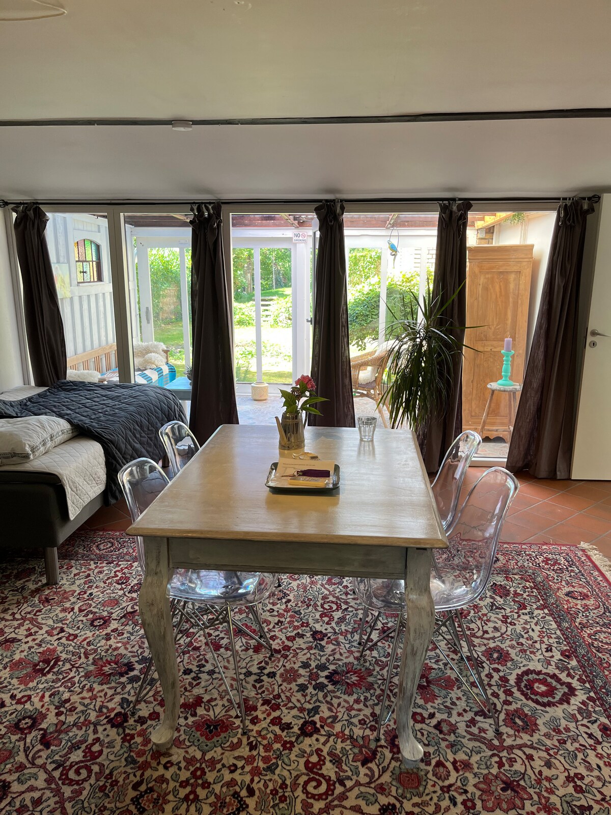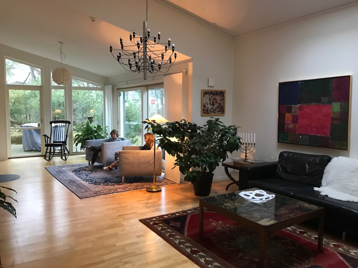 Large, architect-designed cottage with 3 bedrooms and four double beds, a cozy living room, an open kitchen with a dishwasher, a bathroom, and a huge garden. There are multiple terraces, fruit trees,, swings, a trampoline and a grill. The small annex in the garden can be used as a shelter. The sand beach is just a short 700-meter walk away, and it is 5 km to Gilleleje and Rågeleje. Bikes can be borrowed by arrangement. The kitchen is stocked with oil, spices, coffee, and tea for your use.