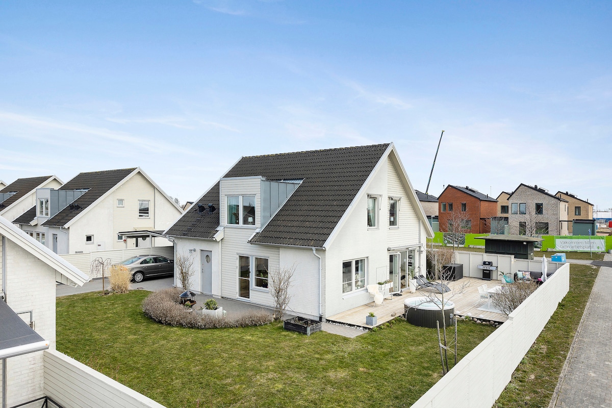 Modern house in a quiet environment surrounded by grazing cows- strawberry and wheat fields. Inviting kitchen/livingroom with a spacious atmosphere. Big kitchen/livingroom with lots of space. Bedroom with a small terrasse. Bathroom. Sauna. Terasse with Pizza oven. Close to swim, surf and beaches as Apelviken,Träslövsläge,and Varberg. Nice for walks, flat running, Road bike and MTB trails. Leisure Bikes available. Bakery, restaurant. Gym, tennis and padel in Johnssons Gård (200 m distance)
