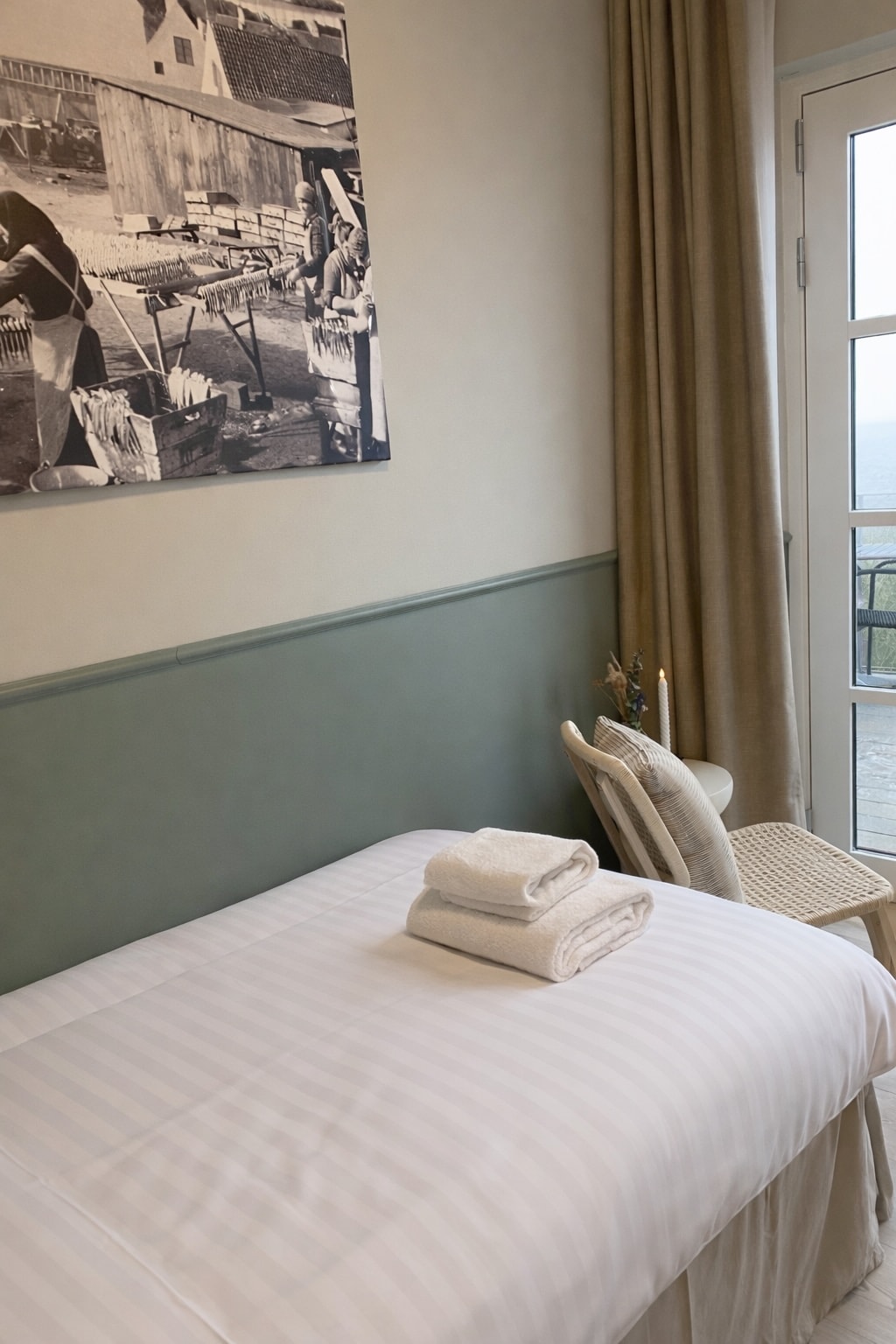 Du har nem adgang til populære butikker og restauranter fra dette charmerende overnatningssted. Du skal vælge dette værelse, hvis du vil bo midt i Gudhjem og kan lide den gamle badehotel-stemning med udsigt til hotellets gård og gamle huse omkring. Værelset har en dobbeltseng. Derudover maskine til kaffe/te og eget lille bad/toilet.