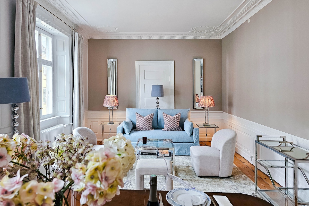 Beautiful and elegant apartment suite located in the most pretty square in Copenhagen's oldest neighbourhood. High ceilings with original design details throughout. Renovated to a high standard with all new bathroom and kitchen in summer 2022. The apartment has everything you need for your stay including washing machine and all amenities. Tivoli gardens, the round tower, Nyhavn, national museum and more are all just a stroll away. The location is one of the best in the city!!