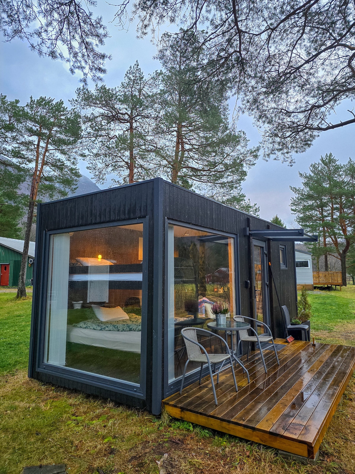 Hør fuglene synge i skogen utenfor mens du sitter i det store vinduet, drikker morgenkaffen og studerer romsdalsfjellene. Minihuset ligger sentralt, men usjenert, i utkanten av en skog i sentrum av Isfjorden. Spenn på deg skia utenfor døra og gå på noen av Romsdalens mest kjente fjell. Eller sitt i sofaen og se på Romsdalseggen du gikk tidligere på dagen. Minihuset har et lite og funksjonelt utrustet hybelkjøkken (kjøleskap og to kokeplater) som du kan lage deg enkle matretter på.