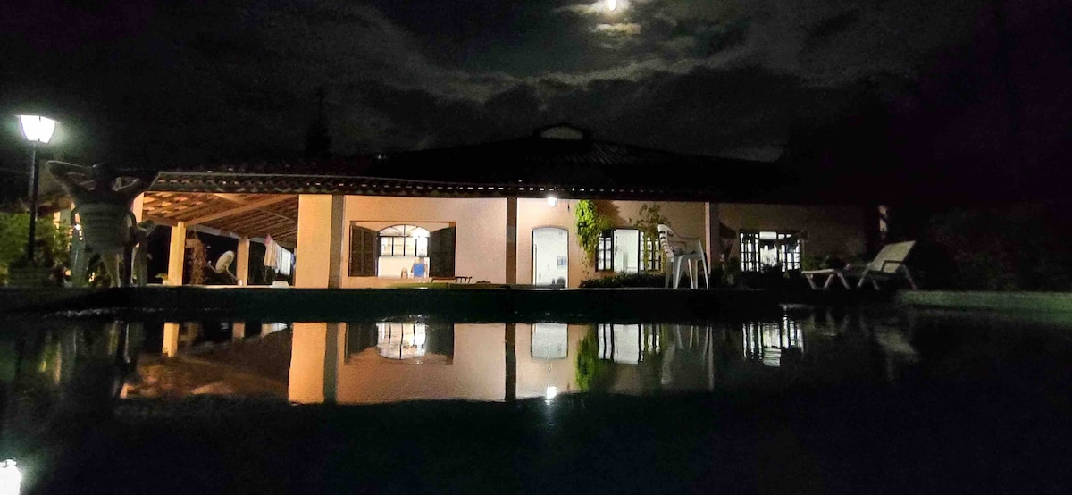 Lindo e mágico espaço com 2.400 m2. Casa principal avarandada que hospeda até 15 pessoas, com 2 quartos, sendo 1 suíte, com uma cama queen-size e uma treliche. Quarto de hóspedes, conta com 1 cama queen e 2 treliches. Na sala tem um sofá-cama retrátil de casal. Linda cozinha completa. 2 wcs e um lavabo na casa principal. Área de lazer com outra cozinha completa, além de churrasqueira a carvão, forno e fogão a lenha, e mais 2 wcs. Piscina com aquecimento solar de 10x4, com spa e prainha com hidro