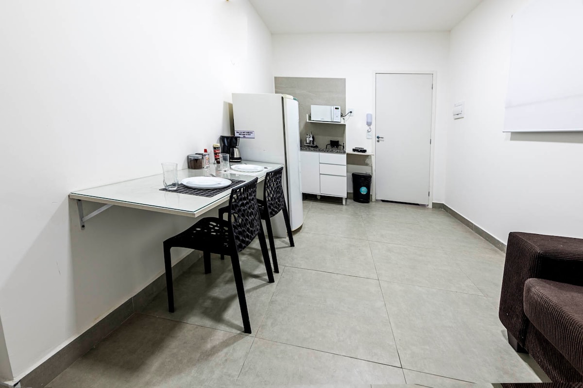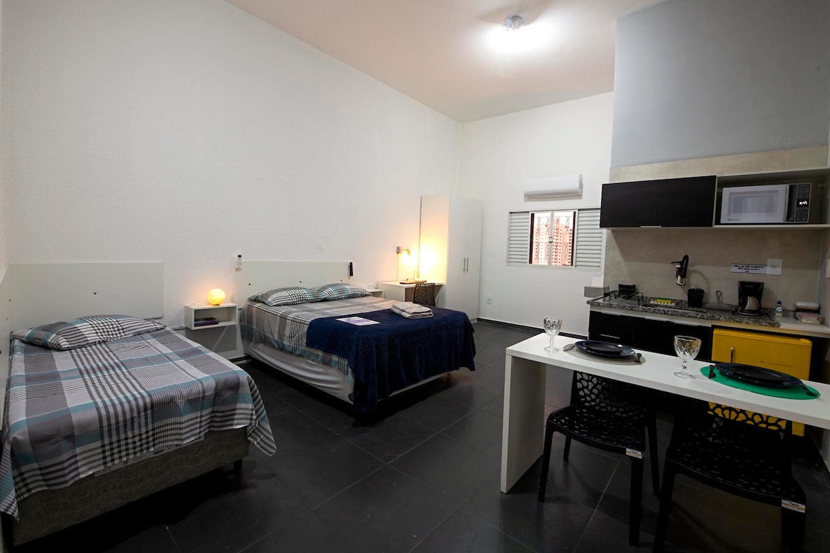 Quarto espaçoso para até 03 hóspedes ideal para familias. Mini Cozinha com pia, frigobar, microondas. Oferecemos Wi-Fi rápido e acesso aos principais serviços de streaming Desfrute de conforto, conectividade e entretenimento durante a sua estadia sua família vai estar perto de tudo ao ficar neste lugar bem-localizado Algumas distancias 05 minutos do Hospital Evangelico 04 minutos do complexo da Eduzz 10 minutos do B.O.S.