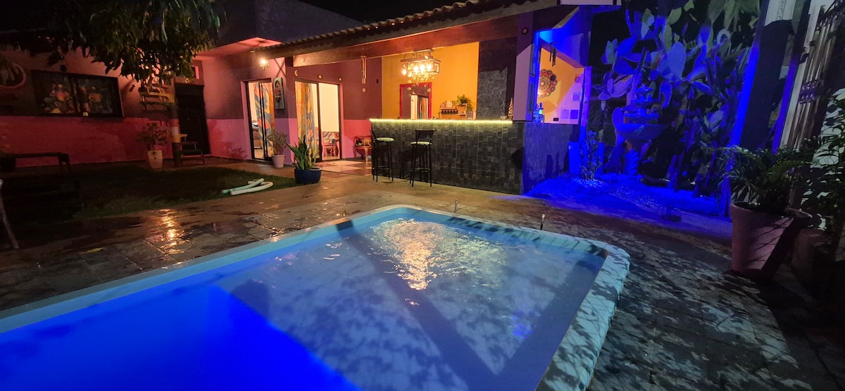 Lindo e mágico espaço com 2.400 m2. Casa principal avarandada que hospeda até 15 pessoas, com 2 quartos, sendo 1 suíte, com uma cama queen-size e uma treliche. Quarto de hóspedes, conta com 1 cama queen e 2 treliches. Na sala tem um sofá-cama retrátil de casal. Linda cozinha completa. 2 wcs e um lavabo na casa principal. Área de lazer com outra cozinha completa, além de churrasqueira a carvão, forno e fogão a lenha, e mais 2 wcs. Piscina com aquecimento solar de 10x4, com spa e prainha com hidro