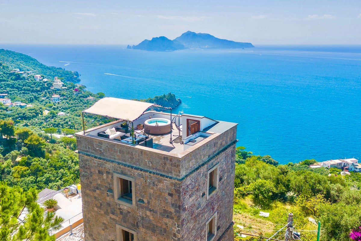 Laze on the wicker daybed before lunch to a Mediterranean backdrop elsewhere on the enormous flagstone-paved covered terrace. Here, traditional stone-lined fireplaces are offset by modern amenities like rain showers, A/C, and fast WiFi. The villa is located in the heart of the Sorrento Coast, the perfect base for exploring the surrounding area. A 600 meters path leads to the enchanting Regina Giovanna beach.