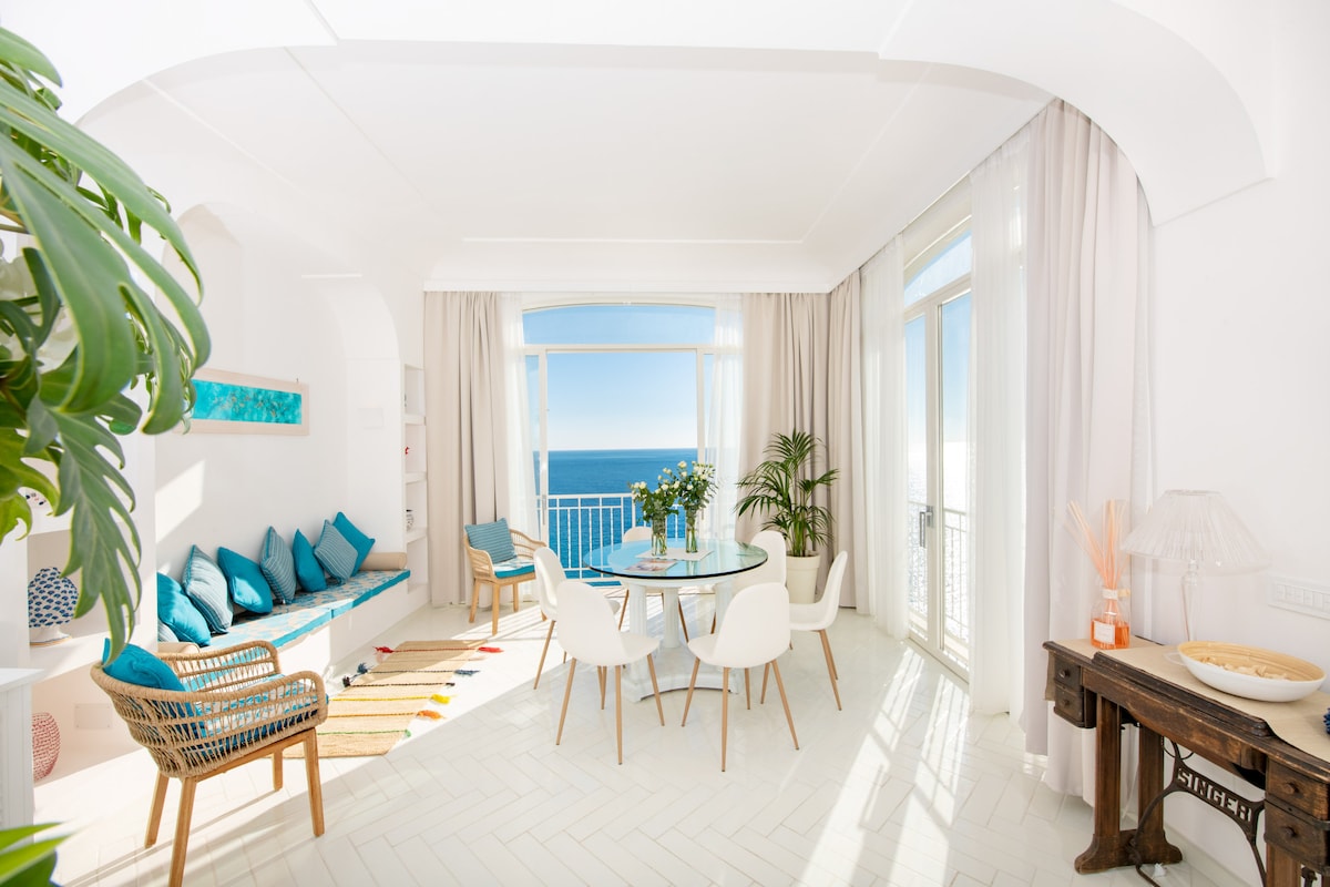 Milky Suite Carla Vittoria is the biggest room of the residence. It features a queen size bed and a private bathroom for comfort and privacy. The suite includes a private living room and a terrace with a view of Positano. Equipped with a smart TV and air conditioning, it ensures entertainment and a pleasant atmosphere. A mini-fridge is available for convenience, and fresh towels are changed daily.