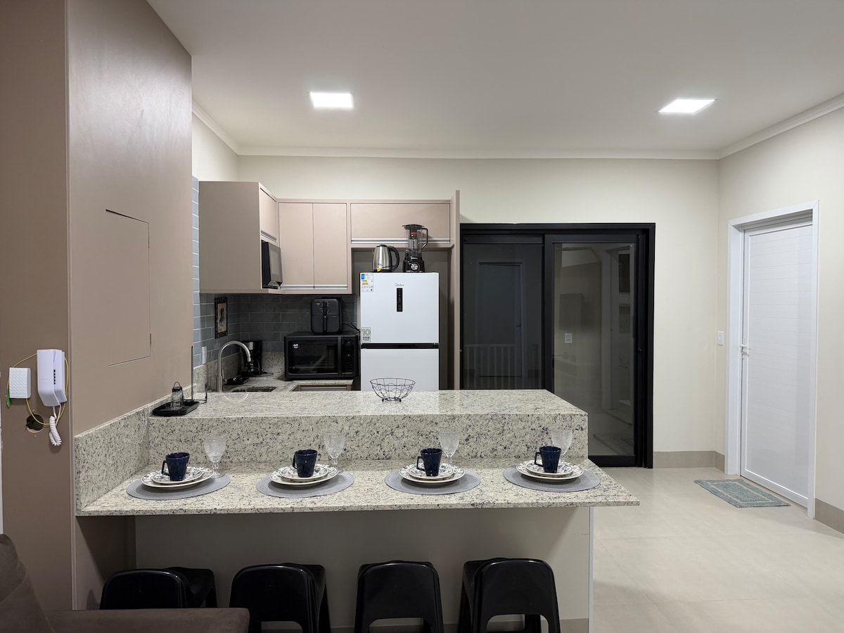 Apartamento confortável, novo, equipado, com 2 quartos, 2 banheiros, churrasqueira, máquina de lavar, wi-fi, ar condicionado nos quartos e sala/cozinha