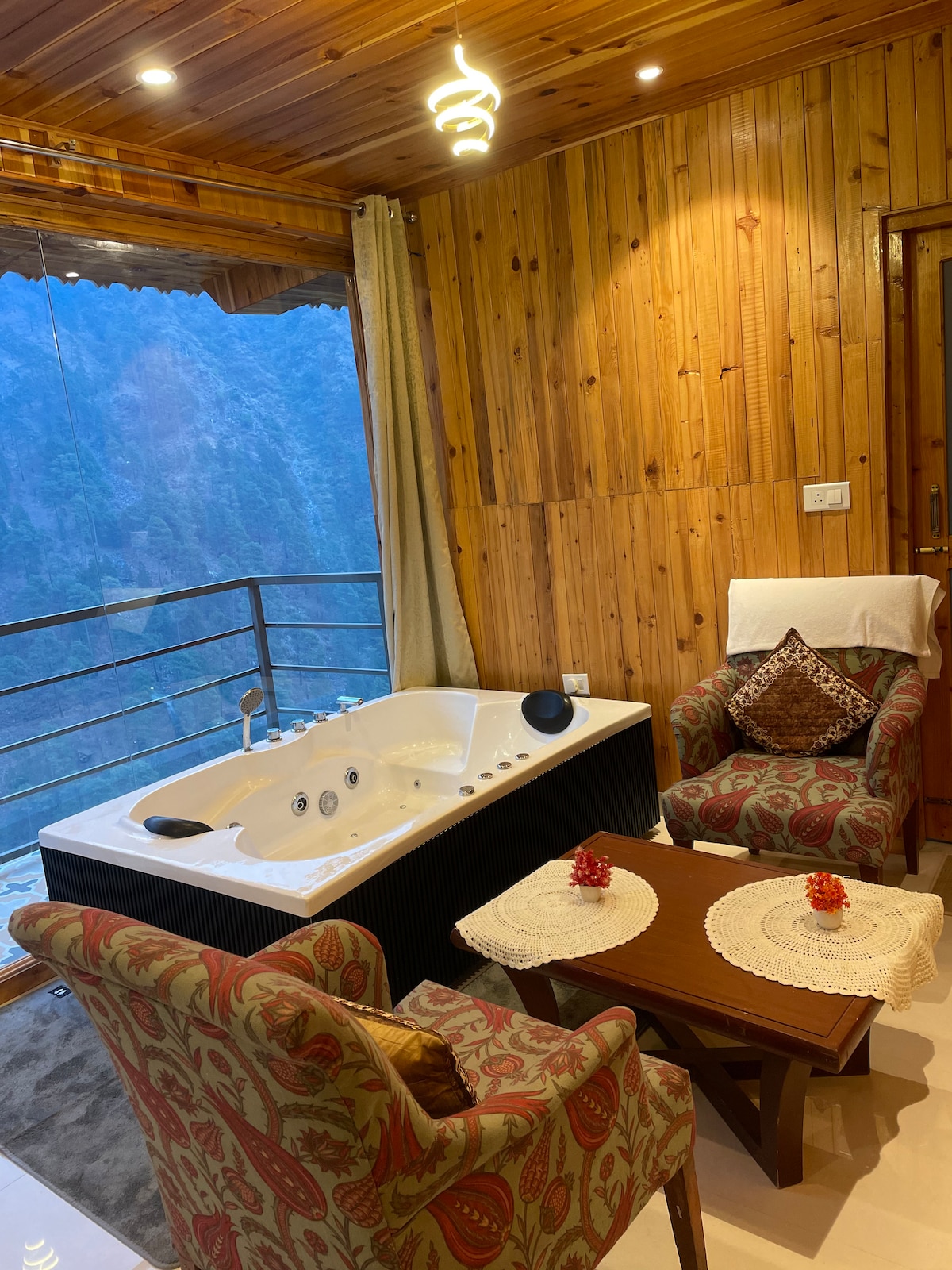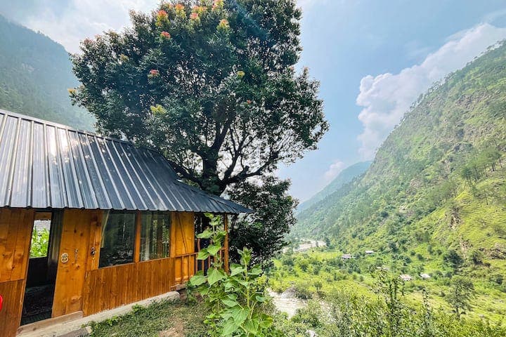 You'll love this unique and romantic escape situated beautifully close to river in Sainj Valley ★ Just near the river ★ Jacuzzi / Hot tub ★ Scenic Location ★ Wi-Fi ★ Food service ★ Bonfire & Garden area ★ Safe Parking Please note, - Breakfast, Room heaters, Bonfire & other services are exclusive of stay price.