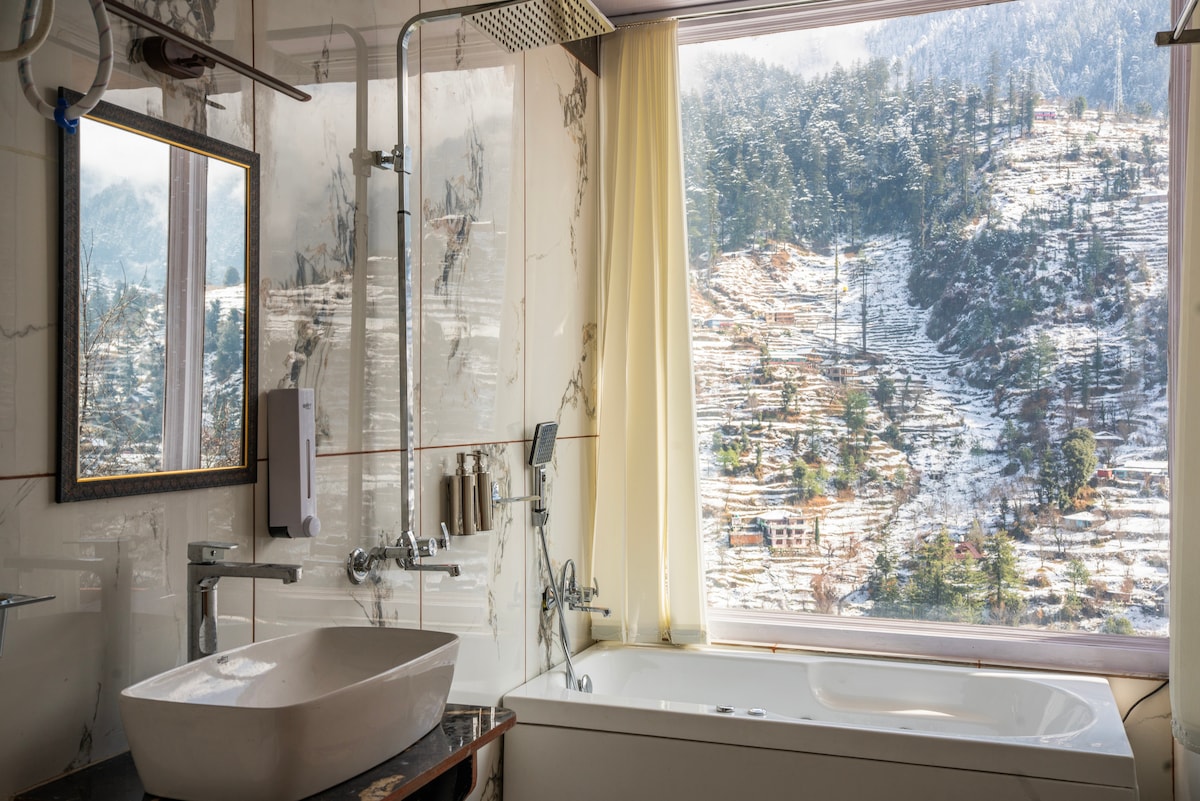 Experience the perfect blend of nature and opulence, perched atop Tandi hill near Jibhi. Delight in a luxurious soak in a hot bubble bath while relishing breathtaking views directly from your bathtub. Nestled away from road and traffic noise, the only sounds you'll encounter are the melodic chirping of birds. With an all-glass cabin, you might even spot a flying squirrel or catch a glimpse of a shooting star in serene night sky. Unwind and enjoy the tranquility of this chic, peaceful retreat.