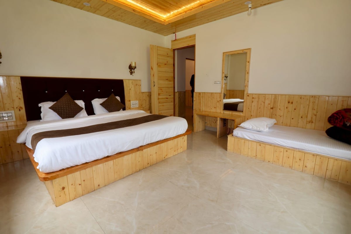 Designed for families and small groups, our spacious Family Room blends modern comfort with warm mountain aesthetics. The room features a plush king-size bed and an additional sleeping area, making it ideal for parents traveling with children or friends staying together. Room Highlights: • King-size bed + extra sleeping space • Spacious layout with wooden interiors • Cozy seating area • Large windows with peaceful views • Flat-screen TV & wardrobe • Clean, modern attached bathroom