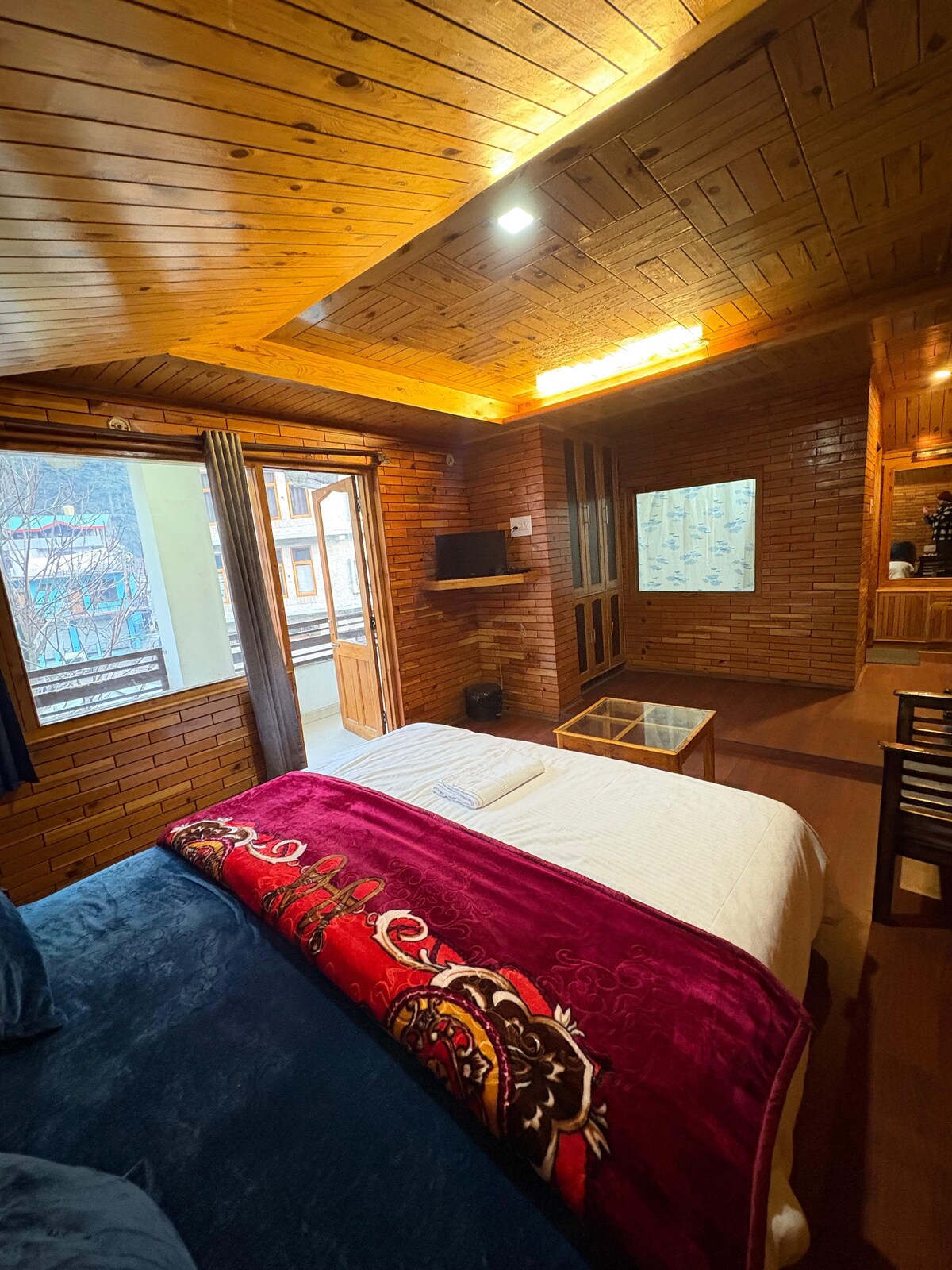 Our Deluxe Rooms have hot/cold air conditioner, wifi, 43 inches smart TV with OTT channels, electric kettle, double bed with 10 inches mattresses with electric bed heaters, river facing balcony & majestic view of mountains. The en suite bathroom has all the necessary amenities like fresh towels, shampoo, body wash, moisturizer, dental kits, 24 hour supply of hot and cold water. The size of the bedroom is 11x12 feet. The bathroom is 7x5 feet. The size of the private balcony is 8x4 feet.