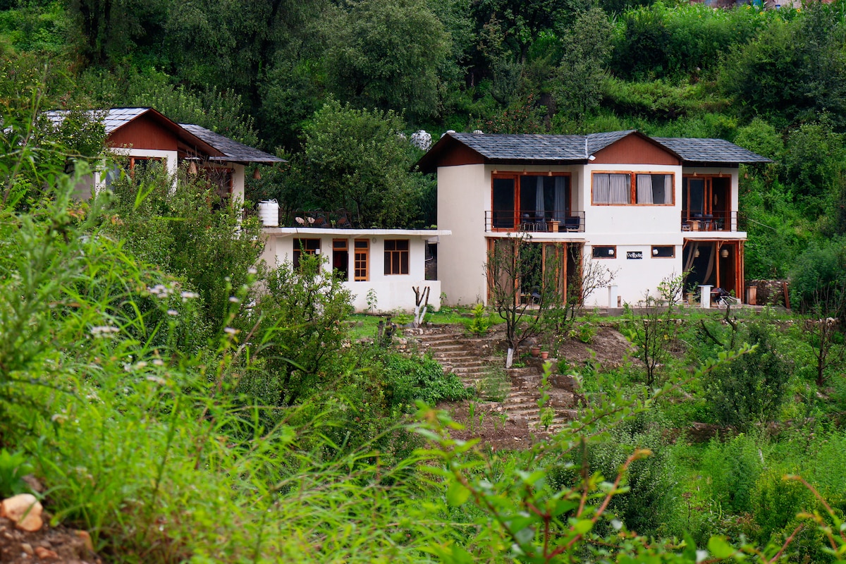 Escape to a creekside mountain home near Naggar, surrounded by deodar forests and apple orchards. Hear glacier water flowing by, enjoy a cozy bedroom, spacious lounge, stocked kitchen, and private outdoor seating for sunrise coffees or sunset fires. A peaceful retreat with WiFi backup, smart comforts, and hiking trails just outside your door—perfect for couples, friends, or solo travellers seeking nature and quiet. Housekeeper keeps the place tidy so you can relax and enjoy.