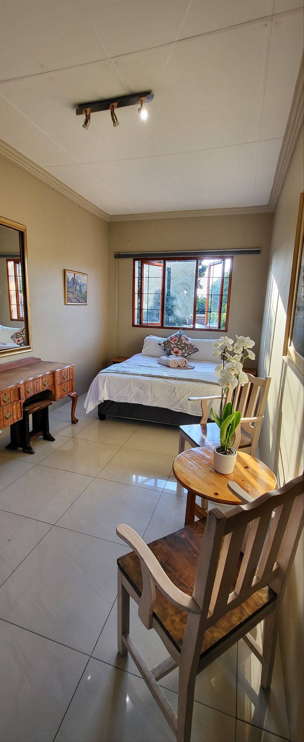 A peaceful retreat nestled in a lush garden, featuring a private entrance and a secluded verandah. Enjoy free, uncapped WiFi and full access to the complete DStv package. Conveniently located near major shopping malls, Wilgers Private Hospital, the CSIR, University of Pretoria, Menlyn, and the N1 and N4 highways. Guests appreciate the safe neighborhood and relaxed suburban atmosphere. Ideal for couples and business travelers, yet spacious enough for families with young children.