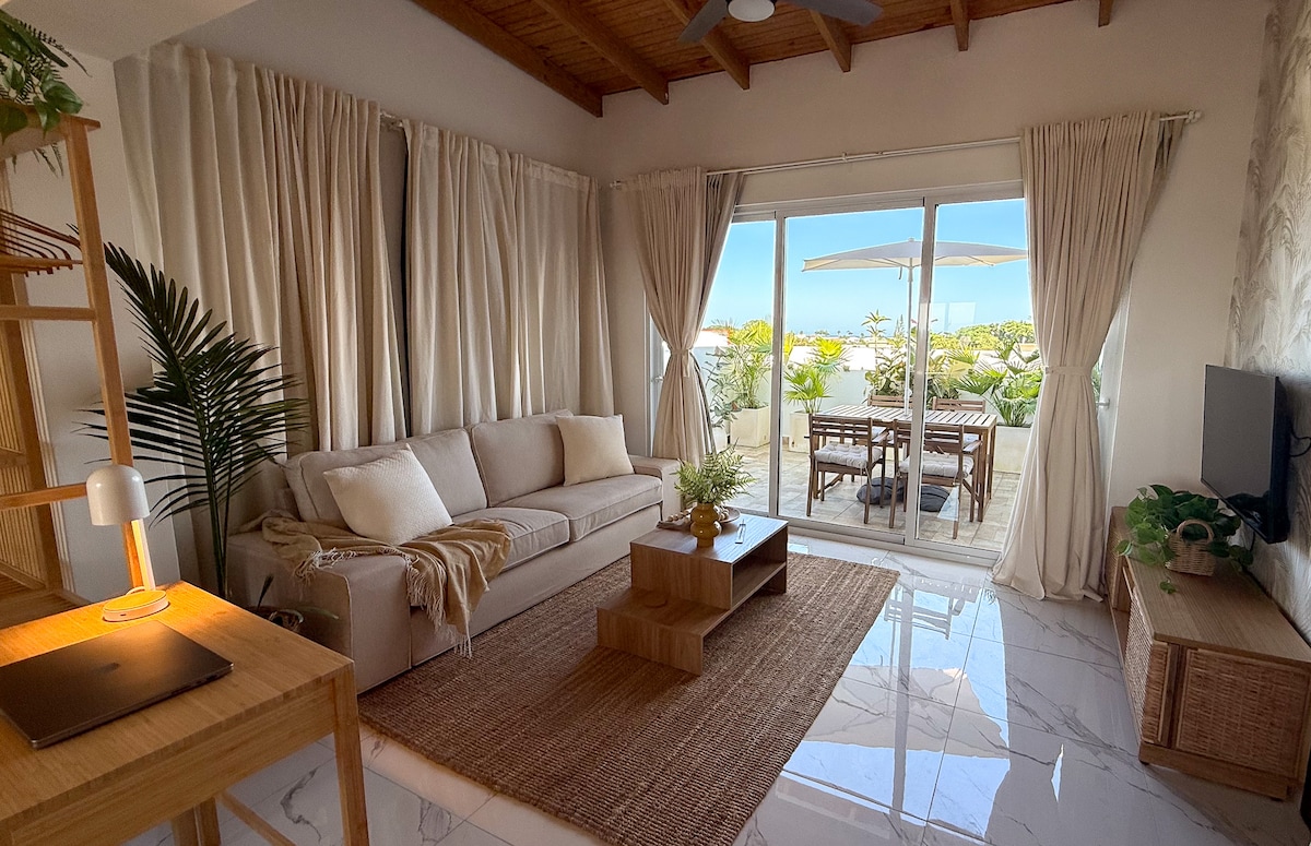 NEW!! Located in the strip of Sosua, this 3 BR penthouse offers a blend of comfort and style. The penthouse features a fully equipped kitchen and a living room with comfortable seating and a flat-screen 65" TV. The bedrooms each have a queen-size bed with private bathrooms. There is a private rooftop terrace with an outdoor dining area and a BBQ grill. The penthouse is located within walking distance of the beautiful beaches and bars of Sosua, making it a great choice for a vacation in Sosua.