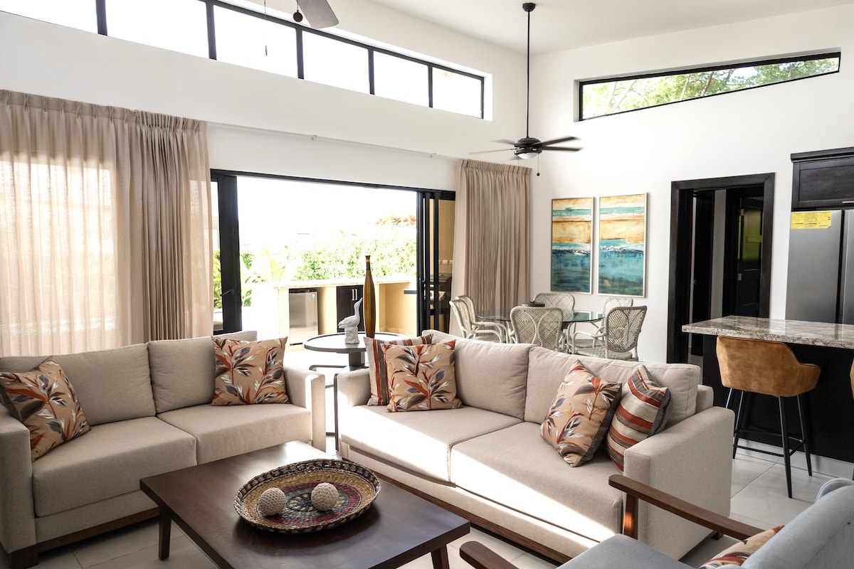 This modern villa is located in a gated community 5 min walk to the beach & Natura Cabana Resort. Nearby are available spa amenities, massages & yoga classes. The villa has 3 bedrooms each with private bathrooms. The 2nd floor owners suite has 2 balconies for taking in fresh air. The crystal clear pool is the perfect place to take a swim or relax in one of the poolside sun loungers. Within the walkable community you will find restaurants, bars and a boutique market.Community has 24h security.