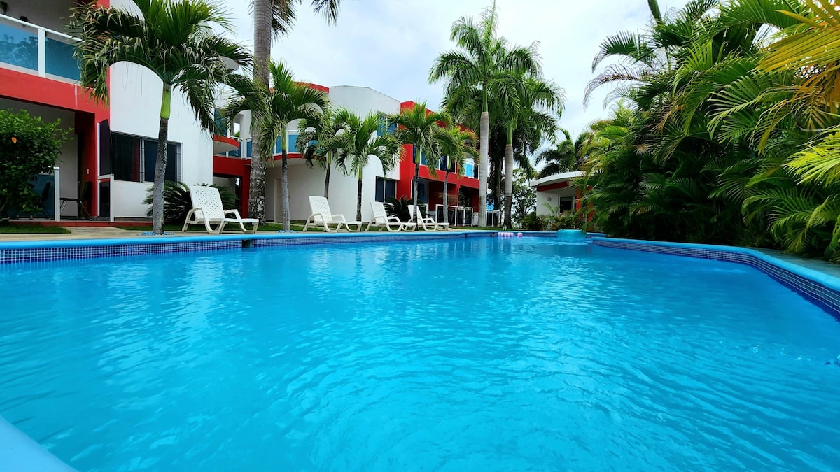 Just 5 minutes from the beach, this stylish second-floor apartment offers 2 bedrooms with queen beds, 2 full bathrooms, A/C, Wi-Fi, fully equipped kitchen, free parking, and 24/7 security. Its high vaulted ceiling keeps it cooler and adds a beautiful sense of space. From our spacious balcony, you can enjoy breezes and, depending on the season, partial views of the ocean. We’re 100% guest friendly, and our on-site caretaker Isidro is always available to assist you.