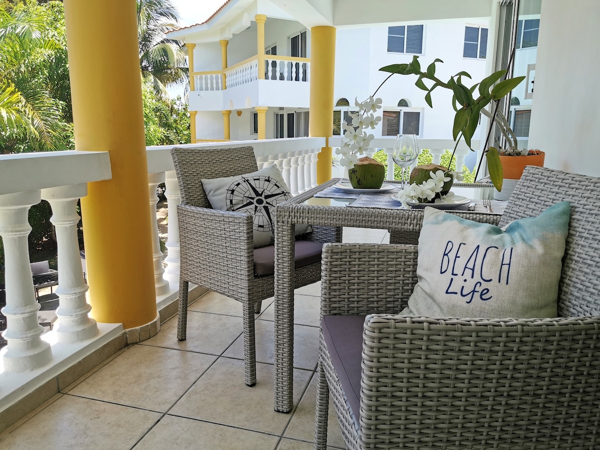 Beautiful and bright 1 bedroom condo located in a luxury beachfront gated community, Infiniti Blu. The complex is located within walking distance of all restaurants bars and shops in Sosúa, but with a tropical paradise feeling. The unit has AC in both the living room and bedroom. Kingsize bed. 50" SmartTV, cable, and wifi. Bottled water is available at request. High ceilings and bright decor for an airy beach feeling. Balcony with outdoor seating and garden view. Electricity is extra.