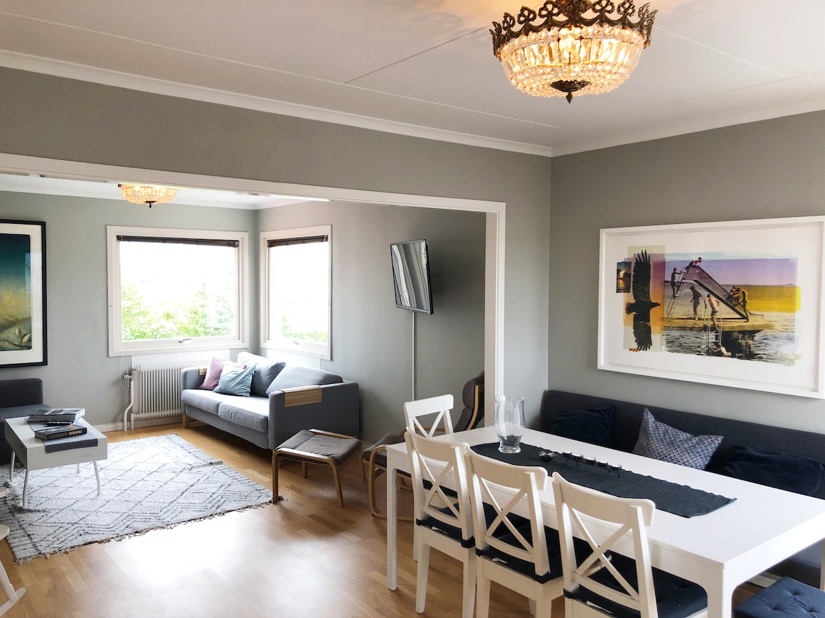 Underbart läge med sol och vacker natur. Promenadavstånd till allt. - Fin 73 m2 ljus modern lägenhet - Stora fönster och utsikt - Tre uteplatser och en Weber gas grill - Sol hela dagen - Öppen planlösning - 2 fina sovrum - 65" TV - Wifi 150 Mbit/s - Egen parkering Städning/handdukar/sängkläder ingår INTE i priset men kan bokas separat, se information längre ner. Välkomna!