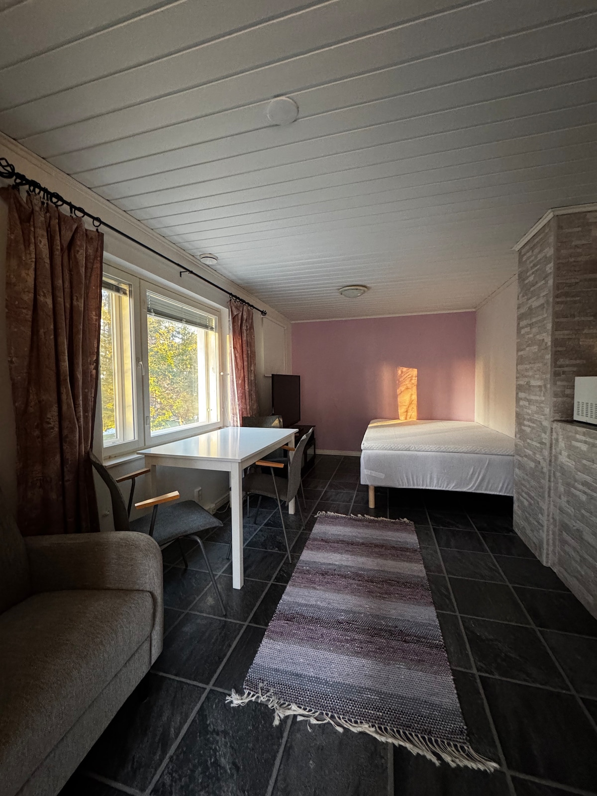 Nauti lomastasi tässä rauhallisessa majapaikassa. Täysin varustellussa huoneistossa on yksi tila, mistä löytyy parisänky, olohuone/keittiö, sekä parvi, missä makuupaikat kahdelle. Lisäksi huoneistoon kuuluu kylpyhuone ja sähkölämmitteinen sauna. Pihalla on terassi ja grillikatos. Maksimihenkilömäärä on 2 aikuista + 2 lasta (alle 14v).