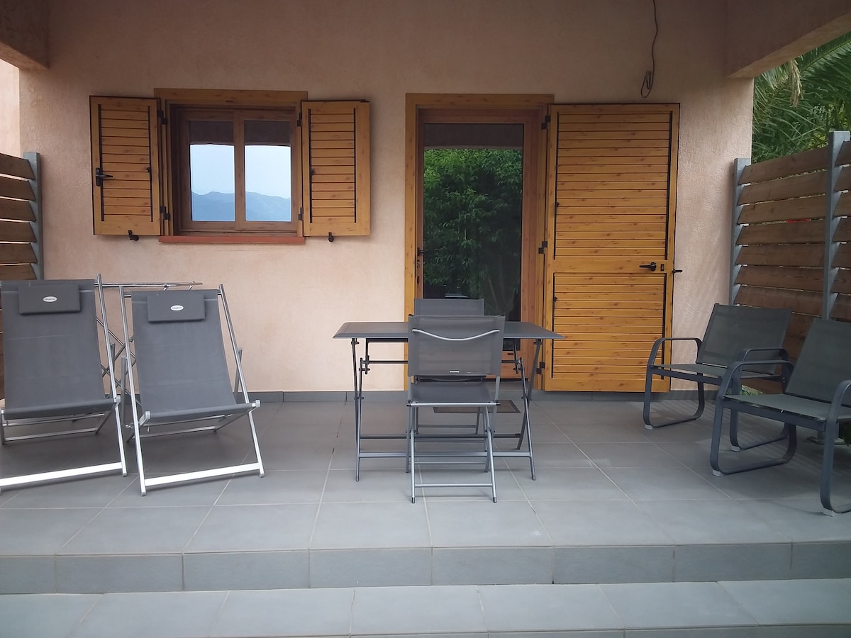 Appartement situé en bas d'une villa neuve. Entrée indépendante, cuisine équipée, terrasse, plancha, télé, clim,équipement fibre . Une chambre avec un lit double + un canapé haut de gamme convertible dans le salon. Cuisine ouverte Logement calme. Idéal couple ou famille avec enfants. Accès à la piscine chauffée.Vue magnifique sur mer et montagne. Situé à 15 minutes de l'aéroport de Figari, 20 minutes des grandes plages de Palombaggia, Santa Guilia.