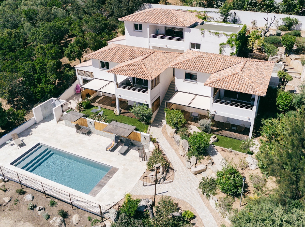 Casa Jeanata 4★: Bohemian chic villa with private pool , panoramic terrace and splendid view of the Aiguilles de Bavella. Absolute tranquillity, 5 minutes from the Cavu pools and 10 minutes from the beaches of Pinarello. 3 bedrooms with en-suite bathrooms. Ideal for holidays with family or friends, combining comfort, nature and exceptional views. Tree climbing, river activities and restaurants 5 minutes away. Beach and water sports 10 minutes away. All shops 5 minutes away.