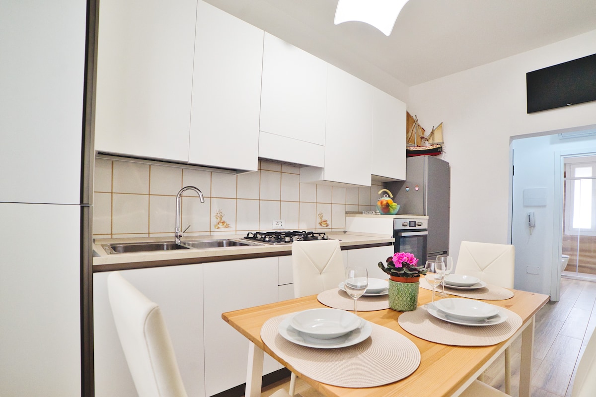 Appartamento arredato a nuovo in zona centrale con parcheggio privato, composto da camera matrimoniale, cameretta, bagno e cucina completa di elettrodomestici con divano, dotato di aria condizionata, tv e wi-fi e terrazzo con vista libera a soli 5 minuti a piedi dalla spiaggia. In loco è possibile richiedere servizio spiaggia e bici. Si presta a tutte le esigenze turistiche: è un luogo tranquillo per chi vuole riposare e ricaricarsi di nuova energia.