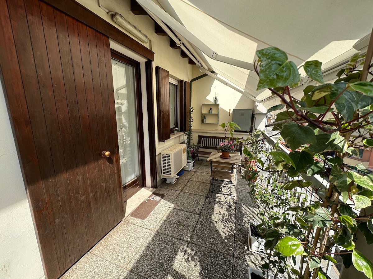 80m2 apartment on the third floor overlooking the historic center and partially on the Vena canal, 150 meters from the boats to / from Venice, with air conditioning. Consisting of a double bedroom, a single bedroom, a living room with a convertible sofa, a brand new kitchen, a bathroom, and with a terrace from which you can also see the lagoon and the port. The terrace has tables, chairs and umbrella to enjoy breakfasts, aperitifs, dinners, or even just sunbathing in complete relaxation.