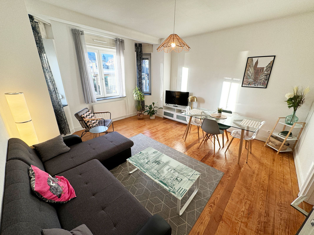 Spacieux 2 pièces de 61m2 tout équipé, à 10 minutes du centre ville de STRASBOURG. L'appartement accueille confortablement 4 personnes. BUS au pied de l'immeuble et nombreux commerces à proximité. Epicerie bio en face de l’immeuble, supermarché Auchan et brasserie STORIG a 150 mètres. LES POINTS FORTS : - entrée autonome : boite à clés pour une entrée en toute autonomie à partir de 15h - emplacement : commerces, restaurants à proximité et arrêt de bus devant l'immeuble