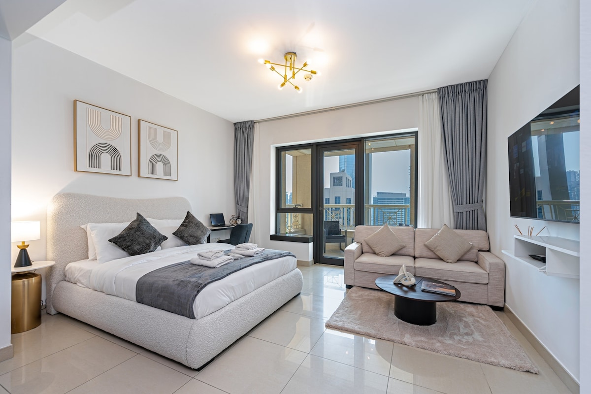 Experience stunning Burj Khalifa views from our stylish high-floor studio located centrally in Downtown Dubai. Sip your favourite drink on the balcony while enjoying the captivating Burj Khalifa light show. Enjoy modern comfort, a fully equipped kitchen, fast Wi-Fi, and access to top-class amenities, all in the heart of the city. Steps away from Dubai Mall, the famous Fountains and vibrant nightlife. Ideal for small families, couples, solo travelers, or business trips.