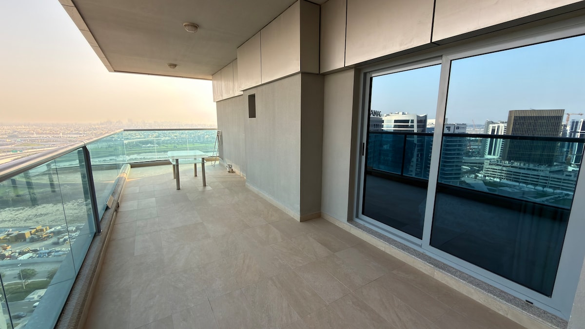 Discover a stylish 2-bedroom apartment on the 19th floor, offering stunning city views and a uniquely huge balcony, perfectly situated near Business Bay in Dubai. This spacious retreat boasts modern amenities, including a fully equipped kitchen, air conditioning, smart TV and wireless internet. Enjoy access to a refreshing swimming pool with Burj Khalifa view and the convenience of a free parking space. Ideal for families, business travelers or couples. Experience the best of Dubai living in thi