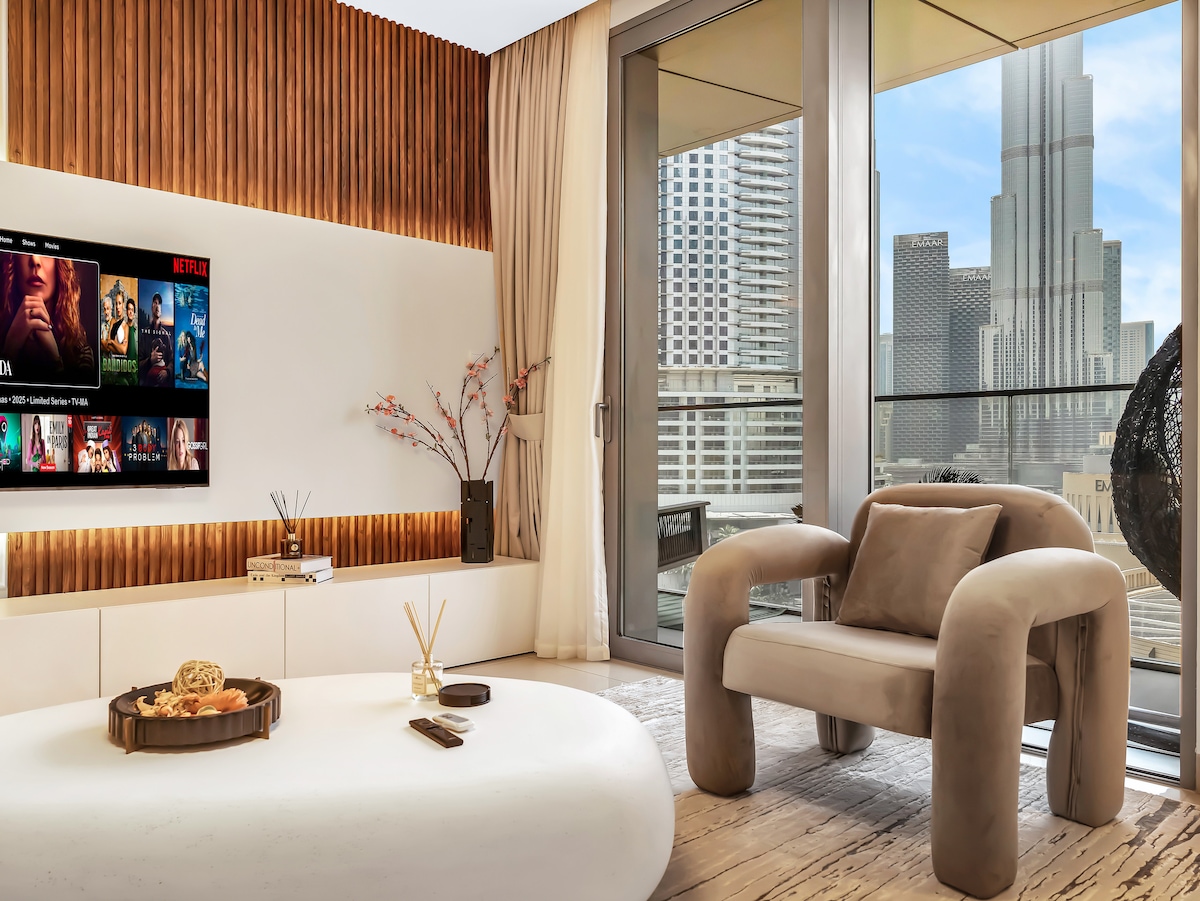 Chic studio in the heart of Dubai with stunning skyline views from your private balcony. Just a 7-minute walk to The Dubai Mall and the iconic Burj Khalifa, you’ll be steps away from world-class shopping, dining, and entertainment. The apartment is fully equipped for business or leisure stays, with luxe hotel-style linens, fast WiFi, a smart TV, and a complete kitchenette. Guests also enjoy free access to the gym and outdoor infinity pool in the building.