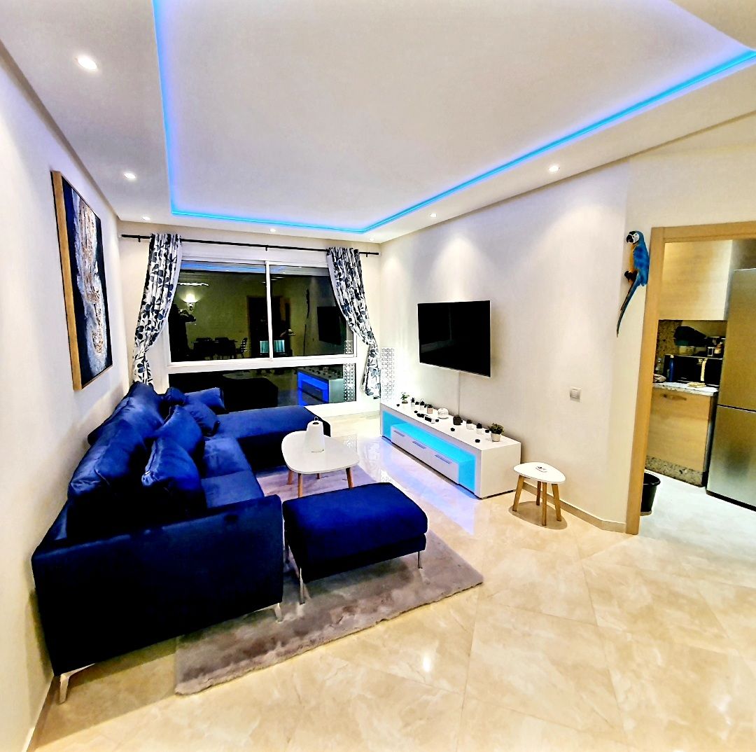 l appartement se compose d'un magnifique salon climatisé wifi fibre optique avec une télé smart 60 pouces application IP tv offert Netflix offert Shahid ... aussi une PlayStation pour vos enfants pour plus de fun. enfance du salon un coin repas avec 6 chaises cuisine moderne très bien équipée avec sortie buanderie pour fair votre linge. chambres parents un grand lit king size television 📺 connecté et climatisation. chambres enfants 2 lit séparé avec sortie vers balcon.