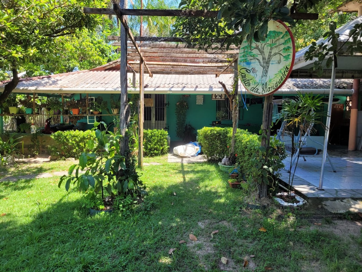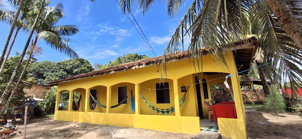 Nossa casinha está sendo disponibilizada para a hospedagem de pessoas que queiram passar uns dias experimentando uma vida simples e natural no sítio em Soure, ilha do Marajó. A Casinha é estilo de sítio mesmo, com jirau na janela, fogãozinho e geladeira. Abriga duas pessoas em uma cama de casal, com possibilidade de mais uma pessoa em um rede. Tem wi-fi, dois ventiladores e banheiro externo feito com garrafas de vidro e fossa ecológica, ao lado do Jardim Mandala e muitas plantas e vida ao redor.