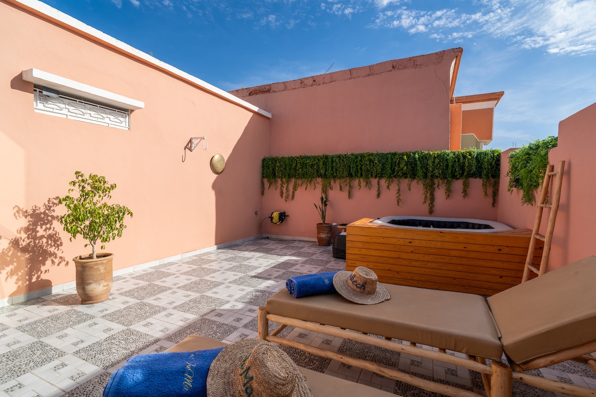 Penthouse situé au dernier étage du riad Dar JuMa, idéal pour un séjour en couple, entre amis ou en famille. Il se compose de deux suites indépendantes, chacune avec sa propre salle de bain, offrant confort et intimité. Vous profitez d’une terrasse privée avec jacuzzi, parfaite pour se détendre après une journée à Marrakech. Accès à la piscine et aux espaces communs du riad, dans un quartier calme et facilement accessible.