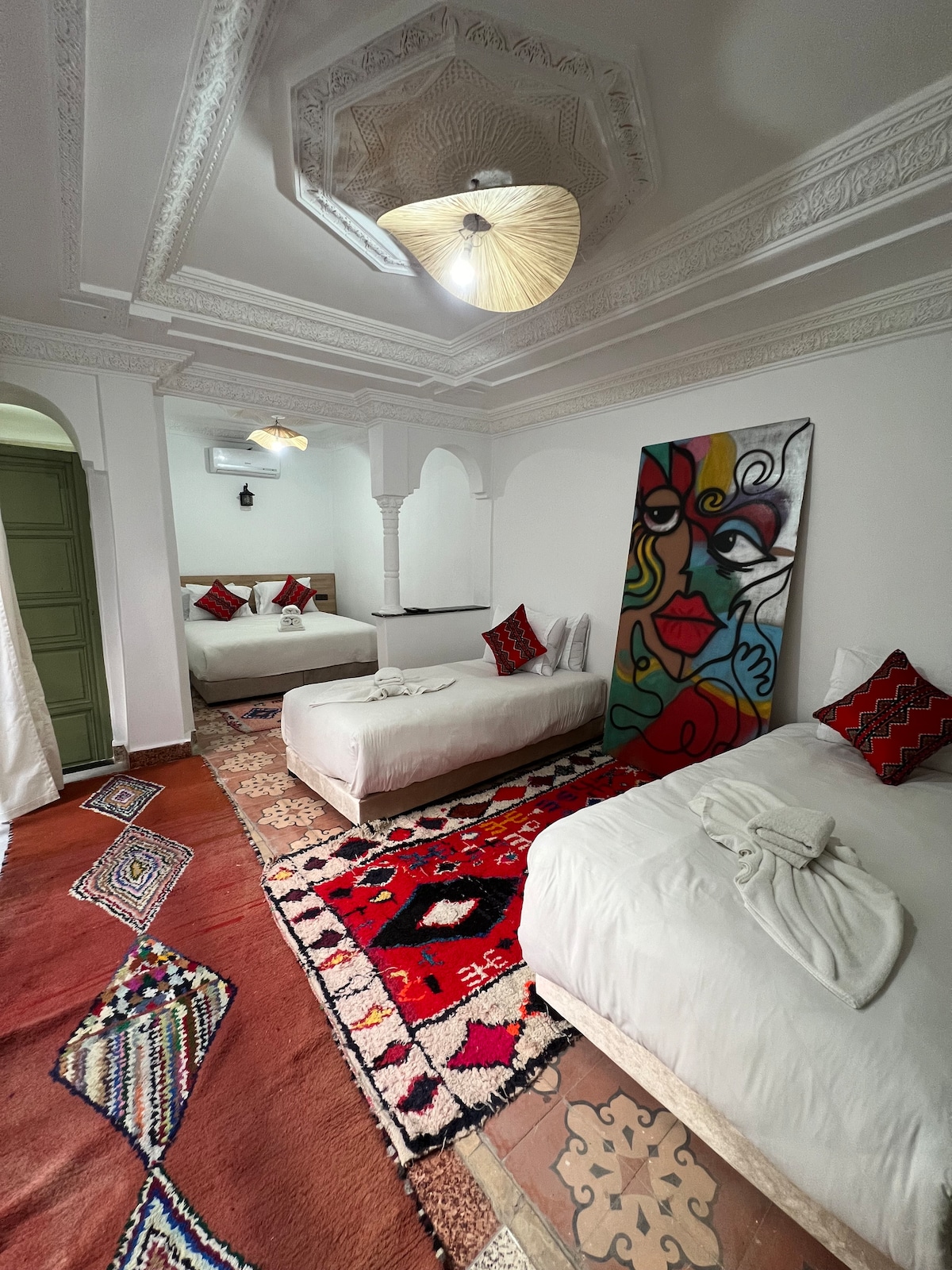 Suite familiale spacieuse située au deuxième étage du riad Dar JuMa, idéale pour les familles ou groupes souhaitant partager un séjour confortable et calme à Marrakech. D’une surface d’environ 100 m², elle se compose de trois chambres, deux salles de bain dont une suite parentale, ainsi que d’un balcon privé. Accès à la piscine et aux espaces communs du riad, dans un quartier paisible et facilement accessible.