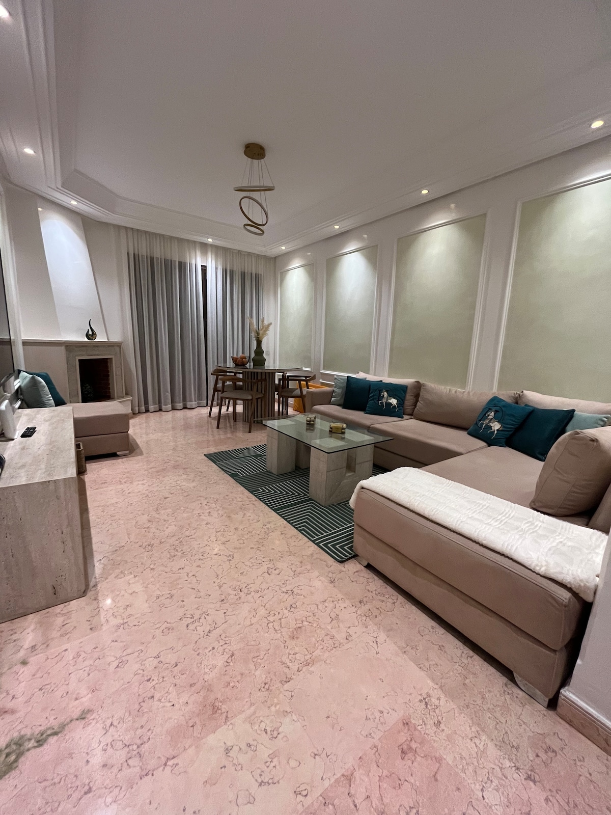 Our apartment is conveniently located in the heart of Marrakech. The train station, numerous cafes, restaurants, grocery stores, and supermarkets are all within walking distance. The airport is just a 12-minute drive away, making it ideal for travelers. • The property offers High-speed Wi-Fi, Netflix & IPTV, air conditioning, an indoor pool, a fitness center, private, covered parking, and 24/7 security & surveillance.